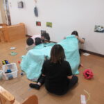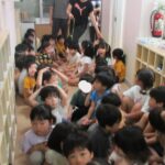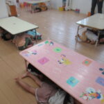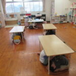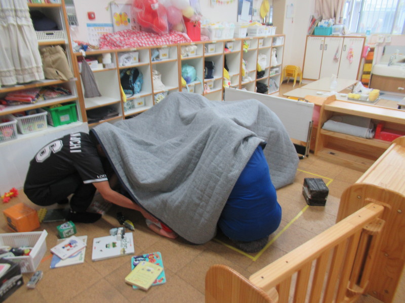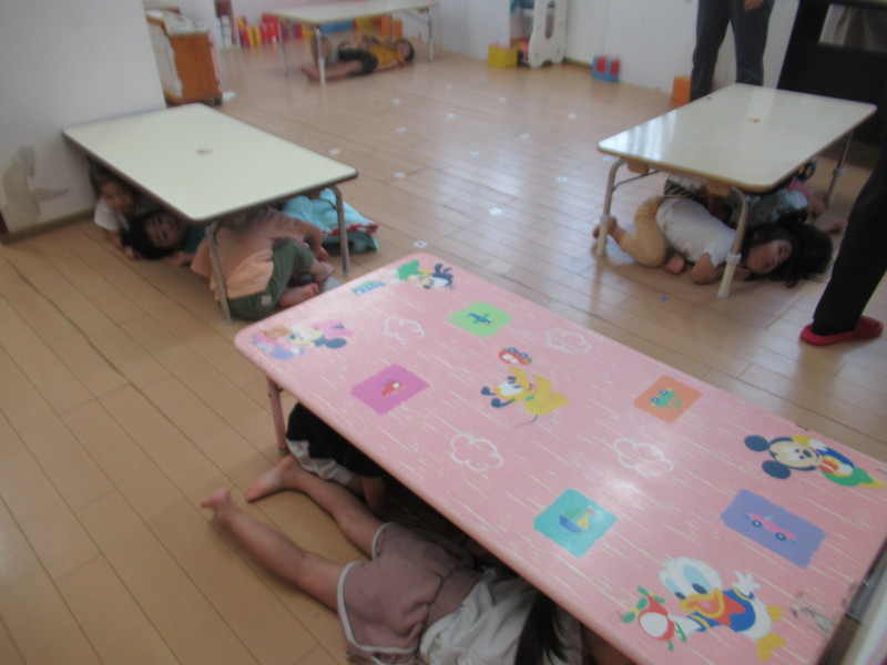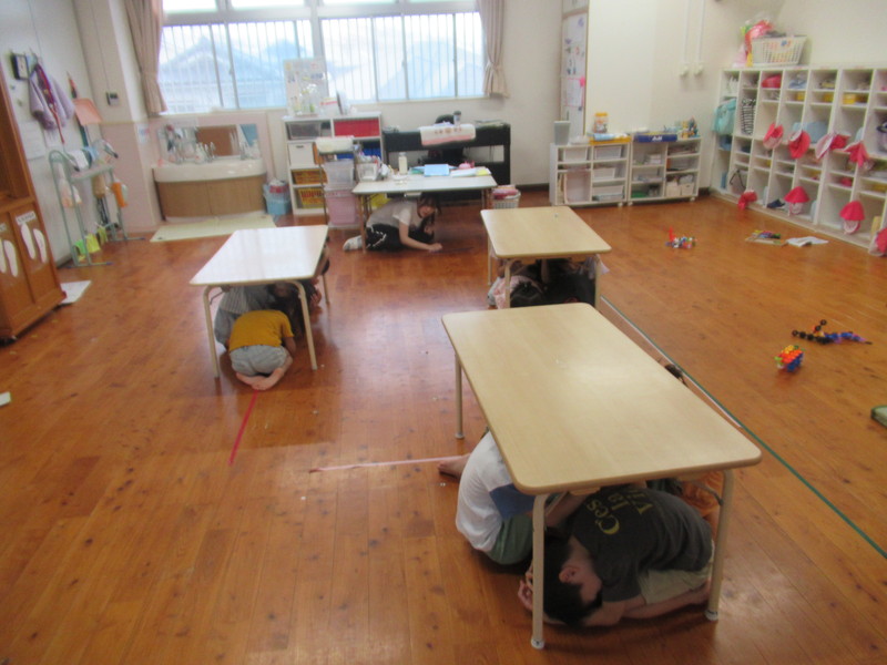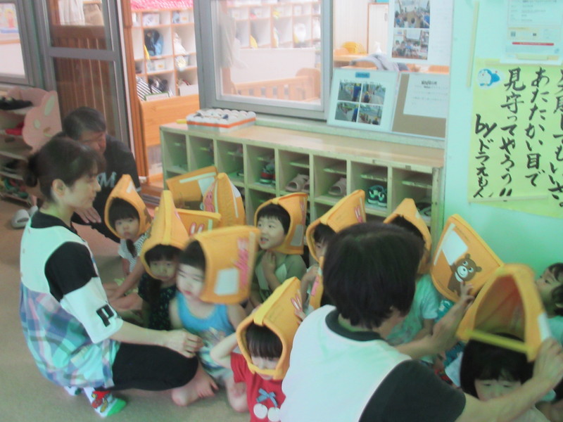 子どもたちは,怖がることもなく,保育室で集まる「一次避難」のあと,放送の合図で避難する「二次避難」を行いました。