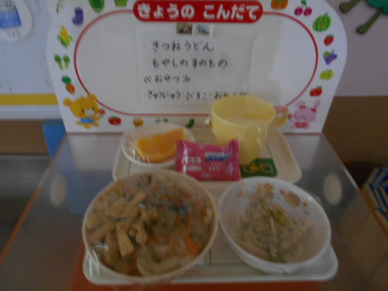 アルバム お知らせ アルバム お知らせ 命の源 紫原の給食 2025年10月4日 【10月4日(土)】 《献 立》・きつねうどん ・もやしの酢の物 《おやつ》・牛乳 ・サブレ(ビスコ) ・フルーツ(オレンジ) 土曜日は,麺類の提供も多いです。 今日は,「きつねうどん」でした。 子どもたちにも好評のメニューです。 ツルツル音をたてながら,美味しそうに食べていましたよ。 ごちそうさまでした。 ★★ 元気に育て 紫原の宝 ★★