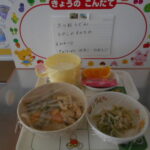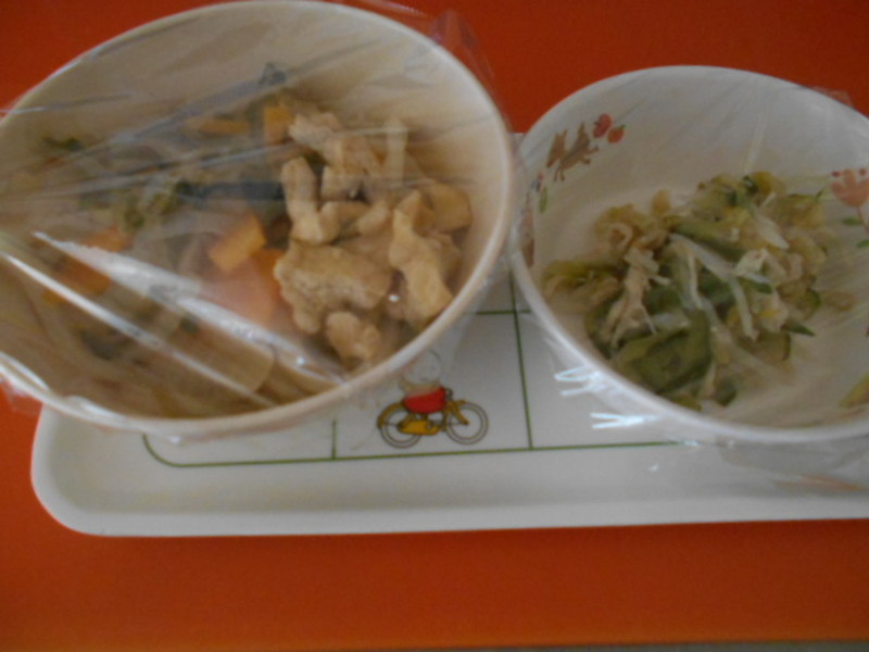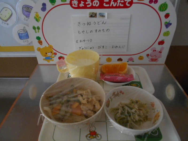 アルバム お知らせ アルバム お知らせ 命の源 紫原の給食 2025年10月18日 【10月18日(土)】 《献 立》・きつねうどん ・もやしの酢の物 《おやつ》・牛乳 ・サブレ(オレンジ) ・オレンジ またまた土曜日。 1週間が早いですね。 今日は,登園した子どもが 人で,とてもゆったりと時間が流れました。 給食は,「きつねうどん」。 土曜日のお昼にうってつけのメニューですよね。 間違ってご飯をもってきましたが,ごはんに麺類という『炭水化物のオンパレード』もなかなかいいものです。 子どもたちもツルツル,モグモグ,完食でした。 ごちそうさまでした。 ★★ 元気に育て 紫原の宝 ★★
