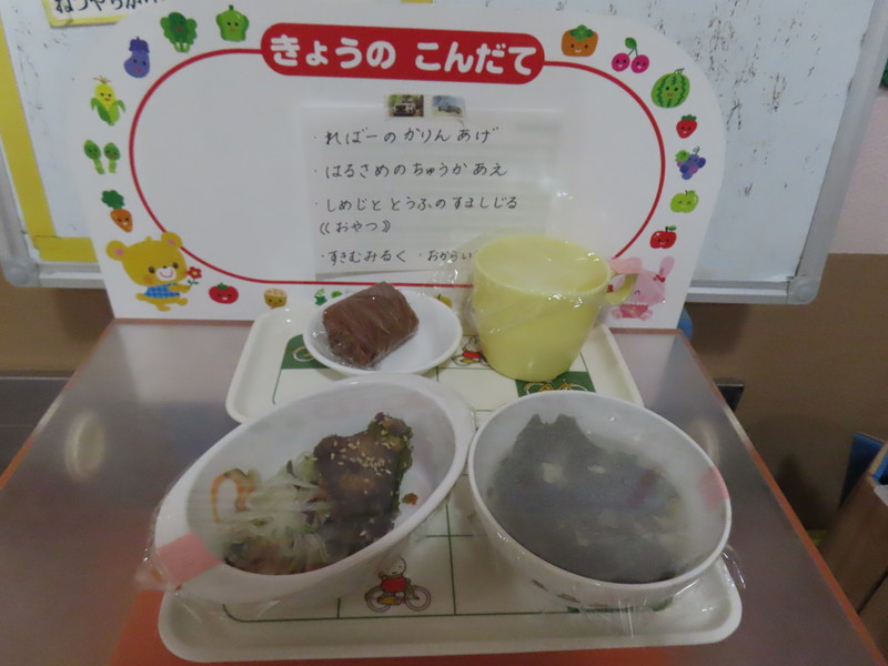 アルバム お知らせ アルバム お知らせ 命の源 紫原の給食 2025年10月21日 【10月21日(火)】 《献 立》・レバーのかりん揚げ ・春雨の中華和え ・しめじと豆腐のすまし汁 《おやつ》・スキムミルク ・おから入りブラウニー 午後からの雨で,ぐっと寒くなってきましたね。 いよいよ? やっと? とうとう? いずれにしても,秋本番を迎えましたね。 急に寒くなりましたので,体調管理には十分気をつけていきましょう。 今日は,「春雨の中華和え」がことのほか美味しかったです。 もちろん,他のメニューも「美味」でした。 ごちそうさまでした。 ★★ 元気に育て 紫原の宝 ★★
