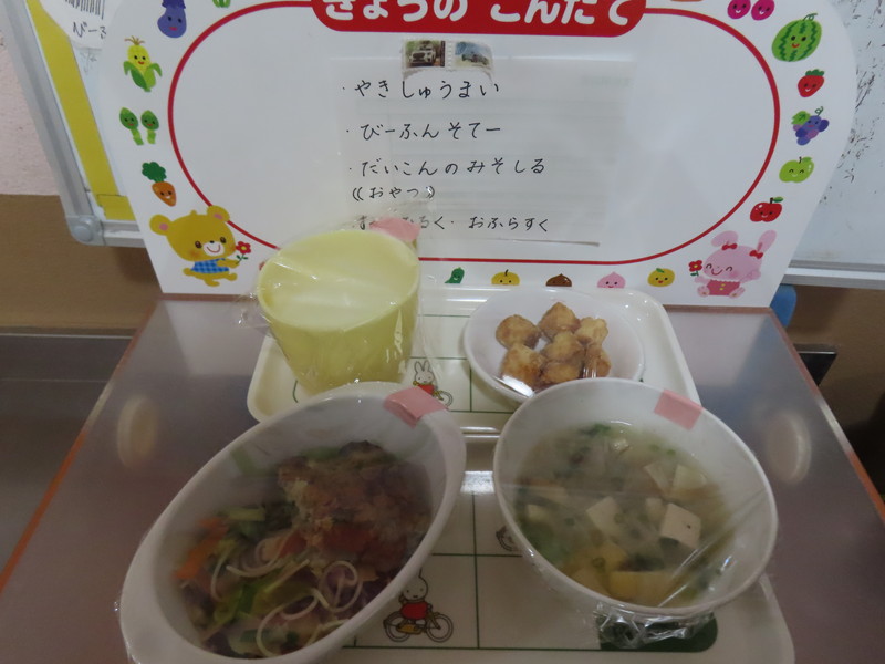 《献 立》・焼きシュウマイ ・ビーフンソテー ・大根の味噌汁