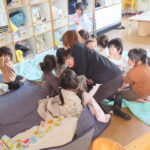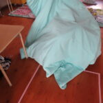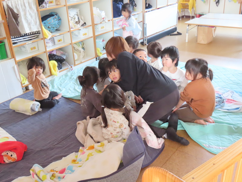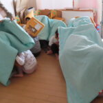 ちょうど,お昼ねの終わりごろでしたが,子どもたちはパッと起きて,職員の指示に従って机の下に隠れたり,1か所に集まってふとんの下に身を寄せたりしました。