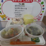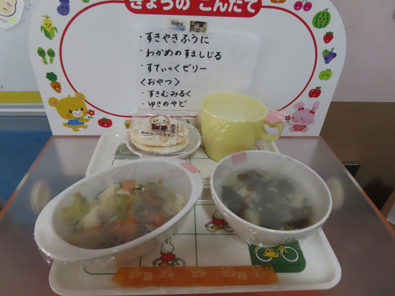 アルバム お知らせ アルバム お知らせ 命の源 紫原の給食 2025年12月19日 【12月19日(金)】 《献 立》・すき焼き風煮 ・わかめのすまし汁 ・ステイックゼリー 《おやつ》・スキムミルク ・せんべい(雪の宿) 今日は,「もちつき大会」を実施しました。 暖かく,風もない,絶好の餅つき日和でした。 餅をつく前には,白米ともち米を見比べたり,つき手とこね手の絶妙のかけ合いを見せてもらったりして,みんなで,日本特有の文化に触れることができました。 お手伝いに来てくださった「仏壮」「仏婦」の14人の方々に感謝でした。 ★★ 元気に育て 紫原の宝 ★★