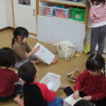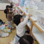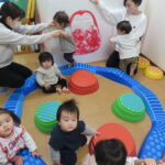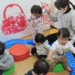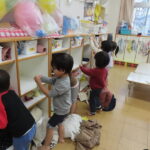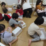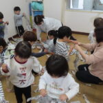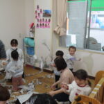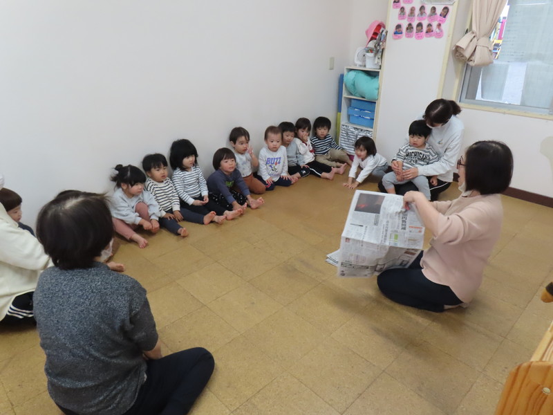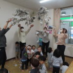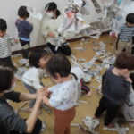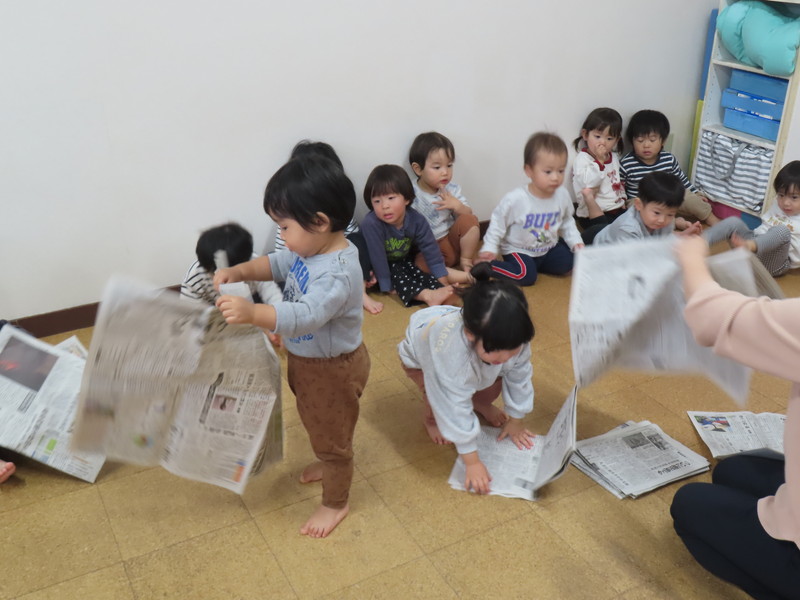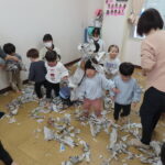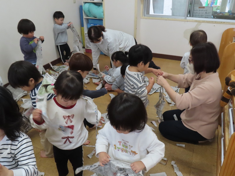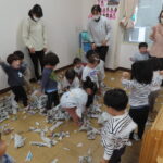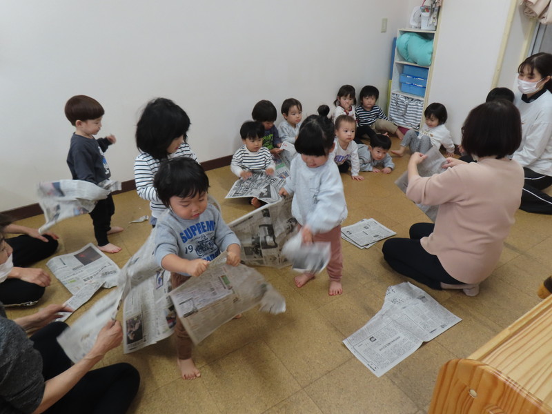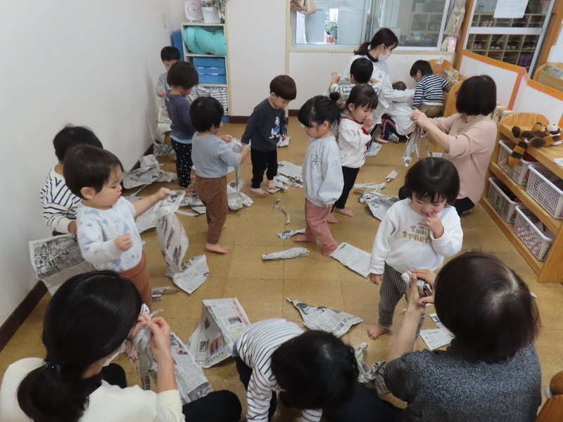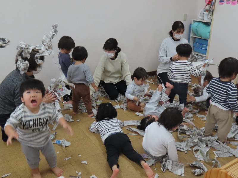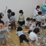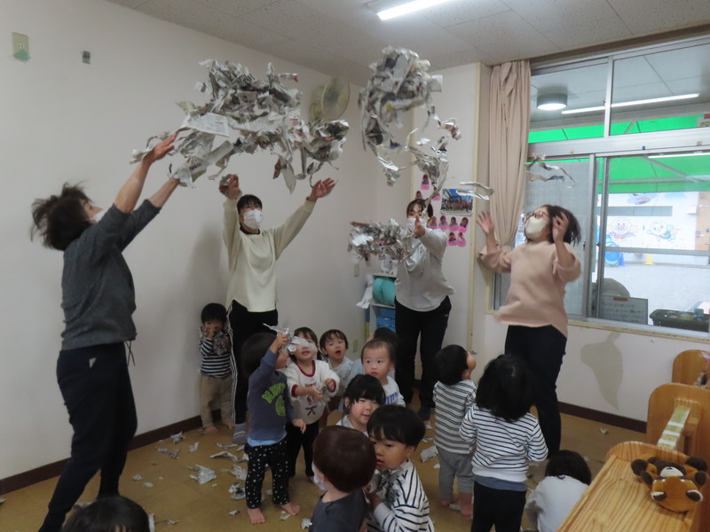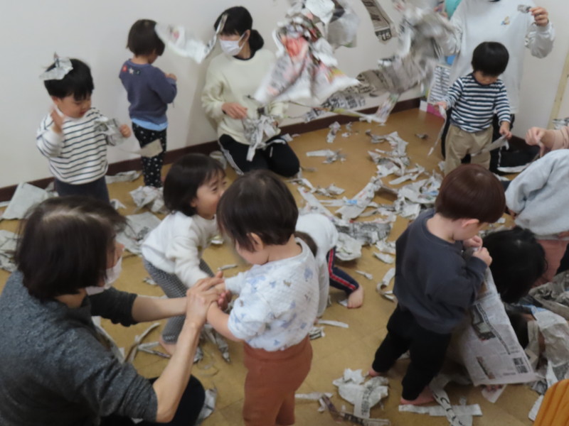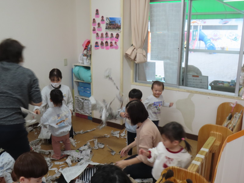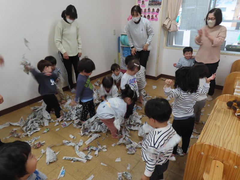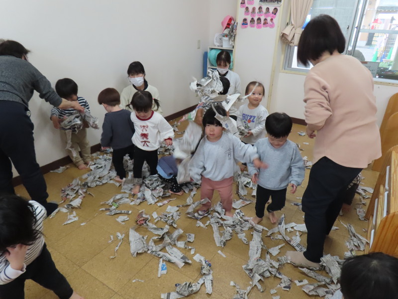 お友だちの誕生日で,みんなでお祝いした後に,新聞紙を使っていっぱいいっぱい散らかして遊びました。