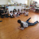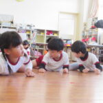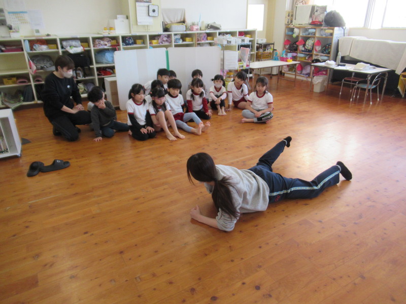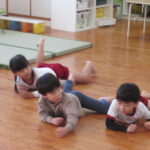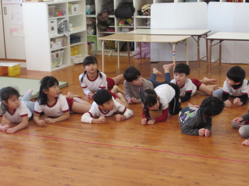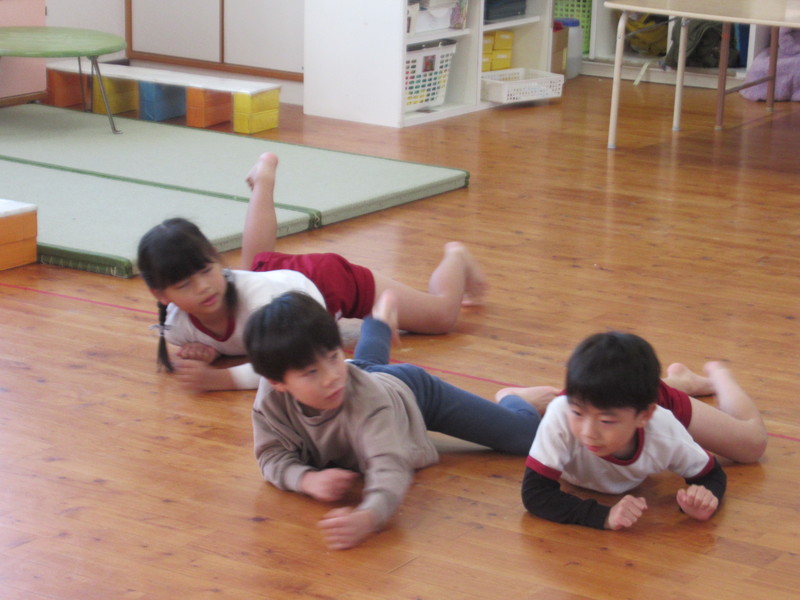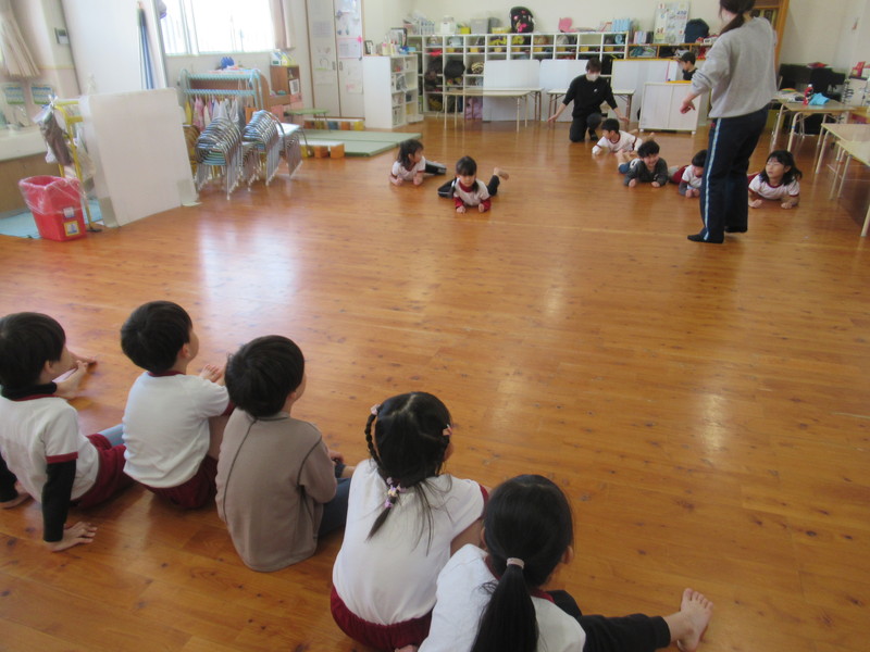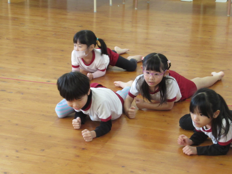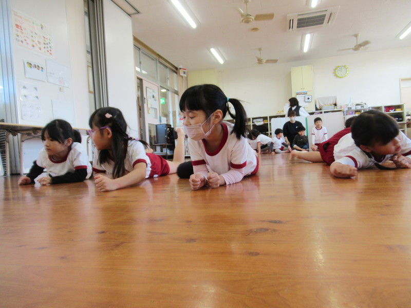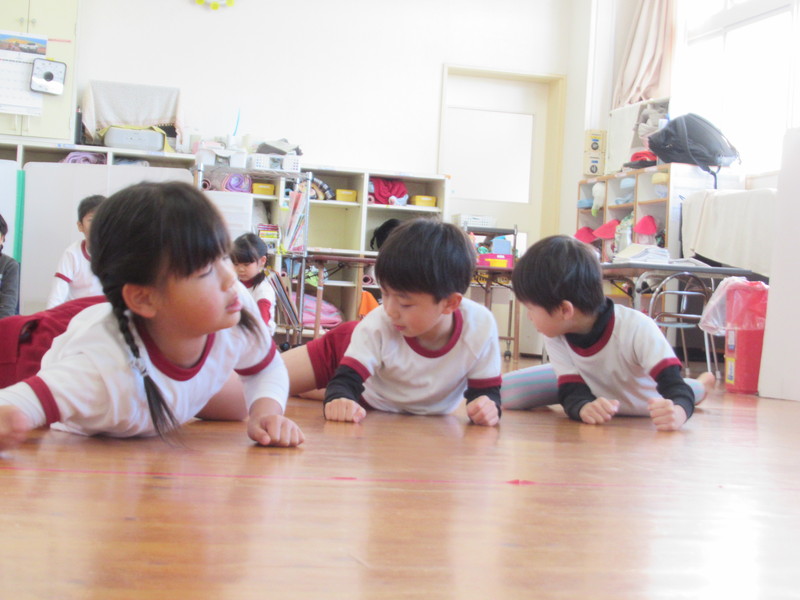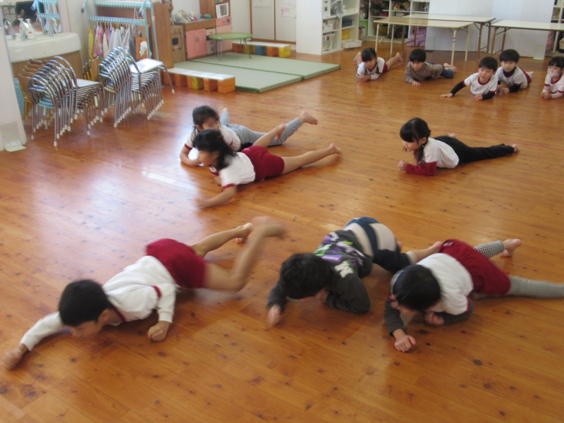 うめ組は,ワニさんになってほふく前進に挑戦しました。