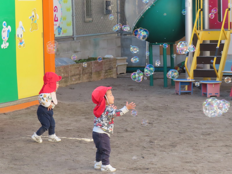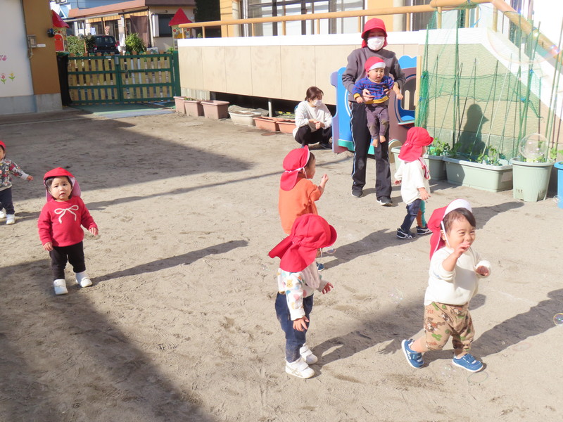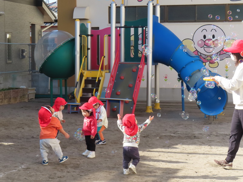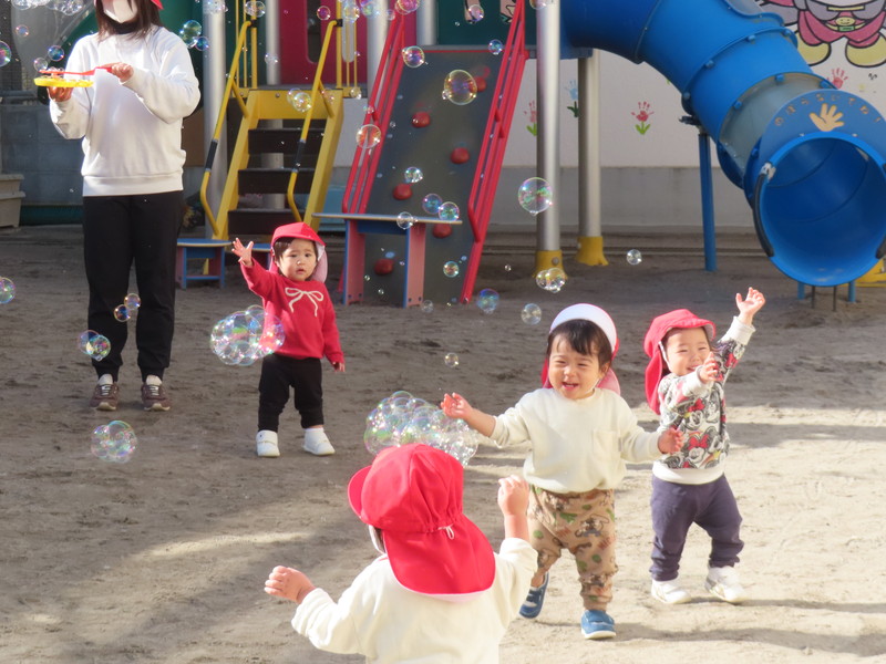 アルバム お知らせ アルバム お知らせ 今日のひとコマ【もも組・全員集合】 2026年1月15日 【1月15日(木)】 もも組・ナイン【全員集合】 令和7年の4月から仲間入りした,われらがアイドル「もも組・ナイン」。 体も心も動きも,大きく成長しています。 4月は3人でスタートしましたが,徐々に仲間が増え,今や9人の大所帯となっています。 おしゃべりもできるようになり,動き回り,毎日大にぎわいです。 今日は,避難訓練のあと園庭を借り切って遊びました。 子どもたちは「シャボン玉」に大喜びでした。 ★★ 大きく育て 紫原の宝 ★★