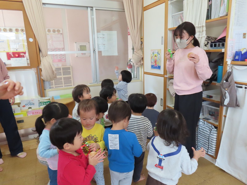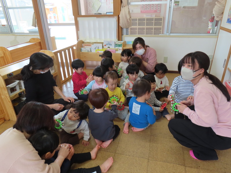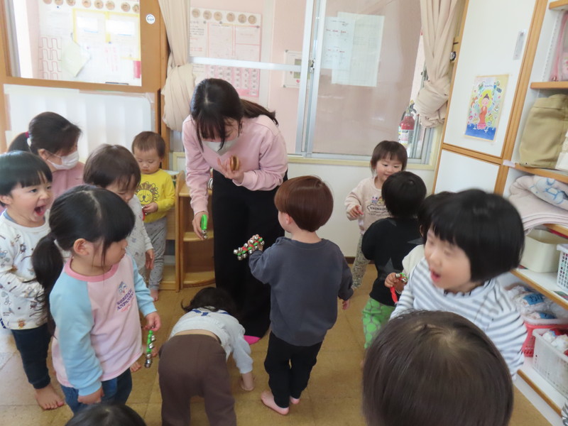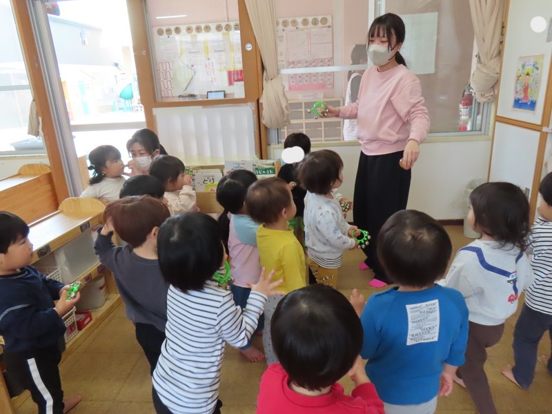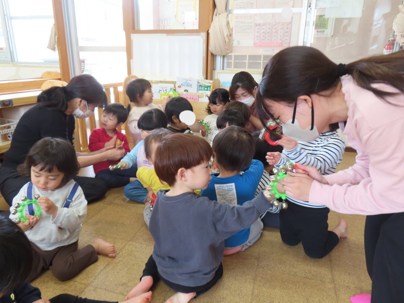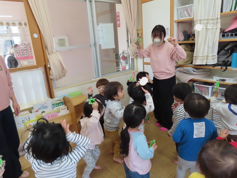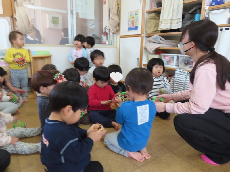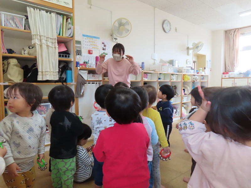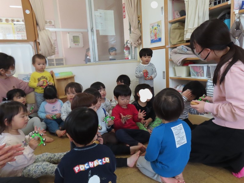 アルバム お知らせ 今日のひとコマ【リズムあそび:ちゅうりっぷ組】 2026年2月24日 【2月24日(火)】 リズムあそび:ちゅうりっぷ組 今日は,保育実習の先生と一緒に「リズムあそび」をしました。 自分が好きな楽器(鈴,カスタネット)を選んで,いろいろな動物になり切ってリズムを打ってみました。 みんなノリノリで,とても楽しいひと時でしたよ。 ★★ 大きく育て 紫原の宝 ★★