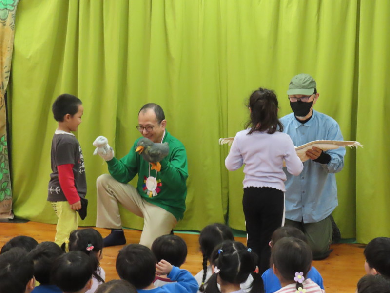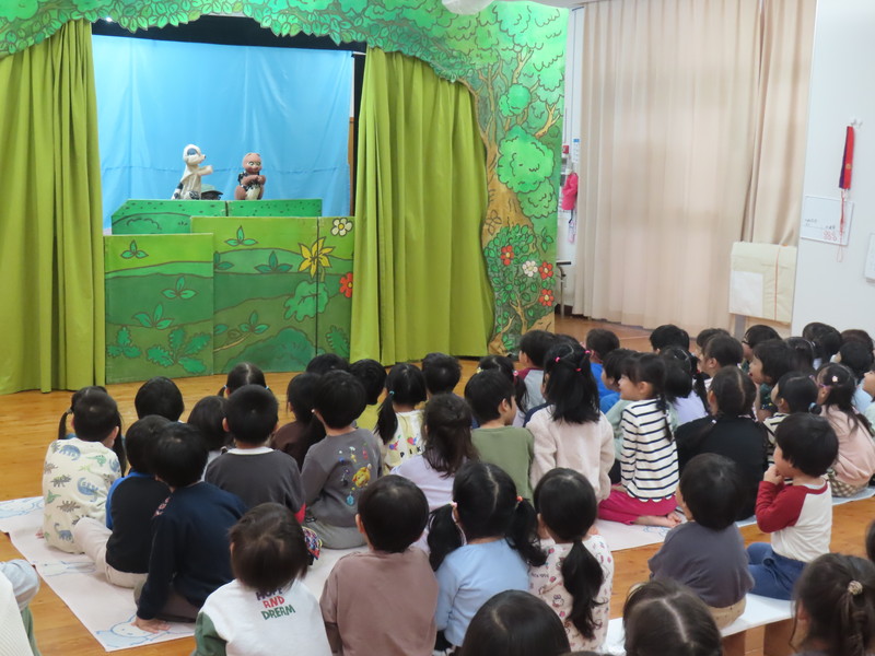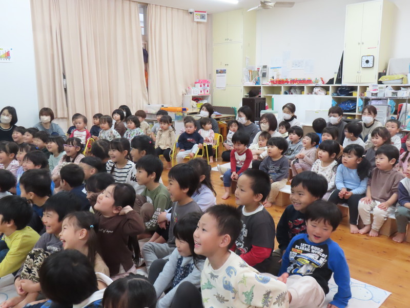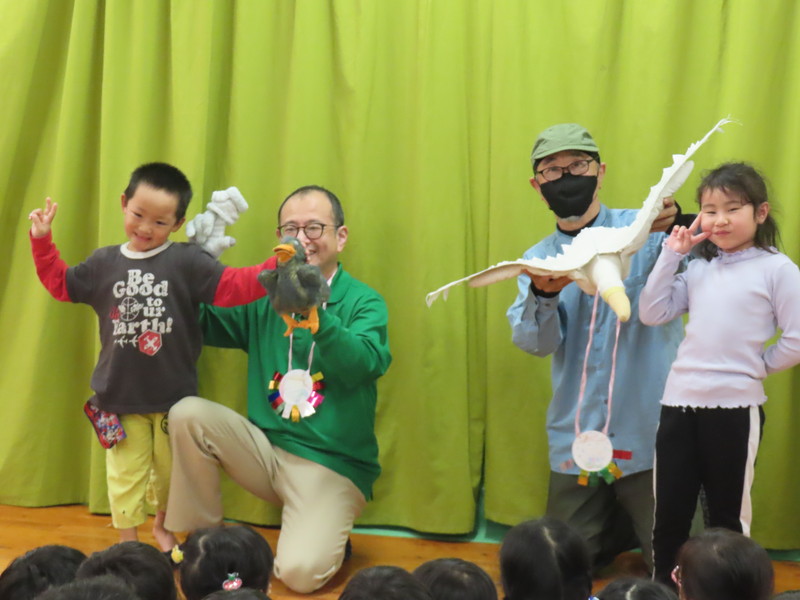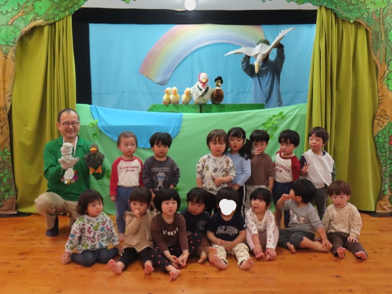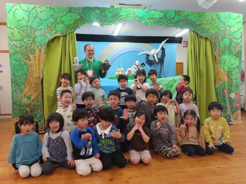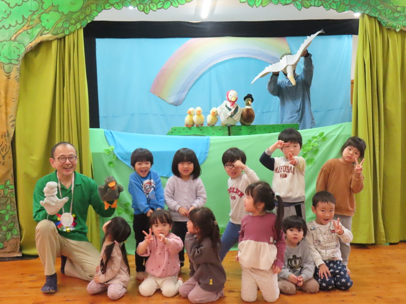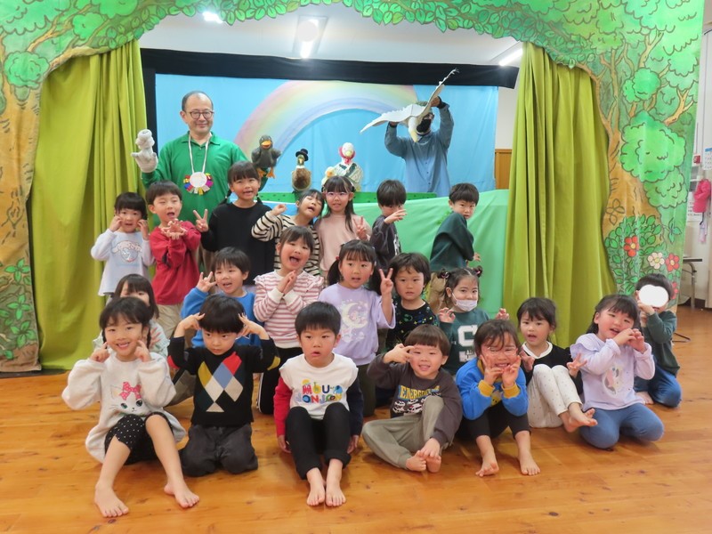 アルバム お知らせ 今日のひとコマ【人形劇を観たよ!】 2026年2月25日 【2月25日(水)】 人形劇を観たよ:『劇団:すぎの子』 今日は,埼玉県狭山市から『劇団:すぎの子』さんに来ていただいて,人形劇を観ました。 演目は,3件。 ① 赤ちゃんのおしごと ② なかよし ③ みにくいアヒルの子 子どもたちも知っている内容もあり,とても盛り上がりました。 とても身近でわかりやすい演目だったので,子どもたちは食い入るように観ていましたよ。 最後は,みんなで「はい,チーズ!」 人形ともハイタッチして,大喜びの子どもたちでした。 ★★ 大きく育て 紫原の宝 ★★