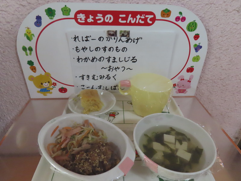 アルバム お知らせ 命の源 紫原の給食 2026年2月25日 【2月25日(水)】 《献 立》・レバーのかりん揚げ ・もやしの酢の物 ・わかめのすまし汁 《おやつ》・スキムミルク ・コーン蒸しパン 今日は,「劇団:すぎのこ」の皆さんが来てくださり,「人形劇」を観ました。 子どもたちは,大きな人形にびっくりしながらも,最初から最後まで食い入るように観ていましたよ。 給食では,子どもたちが大好きな『レバーのかりん揚げ』でした。 本当に美味しいんですよね。 中には, 「レバーは食べられないけど,紫原保育園の『レバーのかりん揚げ』は,食べられるんですよね」 という職員もいるぐらいです。 ★★ 元気に育て 紫原の宝 ★★