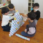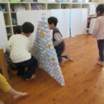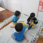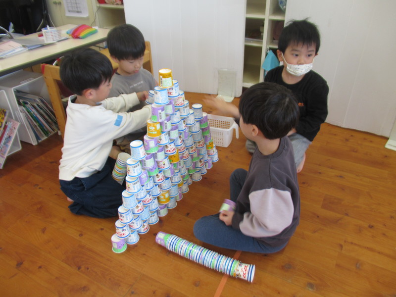 来月から,うめ組,ひまわり組,たんぽぽ組を2グループに分けて,それぞれのクラスで縦割り保育を実施します。