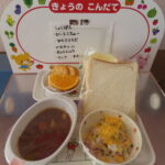 アルバム お知らせ 命の源 紫原の給食 2025年11月29日 【11月29日(土)】 《献 立》・食パン ・ビーフシチュー ・ミモザサラダ 《おやつ》・牛乳 ・リッツ ・フルーツ(オレンジ) 今日は,11月最後の登園日でした。 登園したのは30人。 今日現在で,4人の子どもが「インフルエンザ」に罹患しています。 この土・日で,しっかり休養をとって,全員が参加できるように念じています。 ★★ 元気に育て 紫原の宝 ★★
